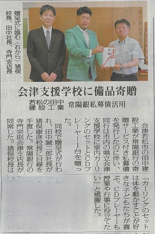先日、私募債を活用して会津支援学校様へ「カーリングセット」「CDプレイヤー」を贈らせていただきました。