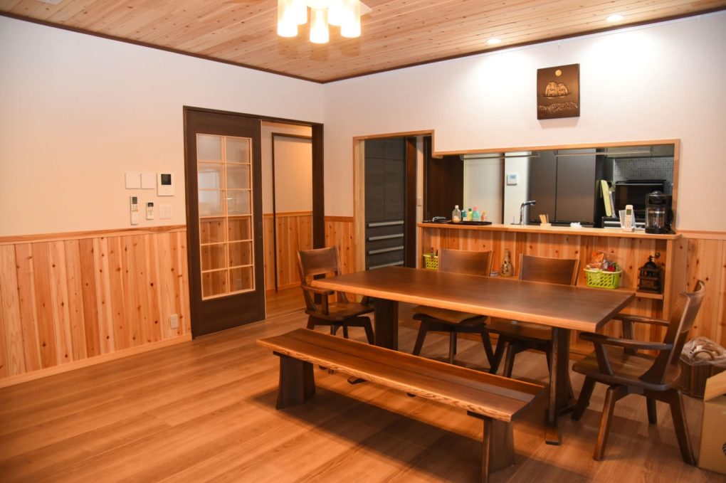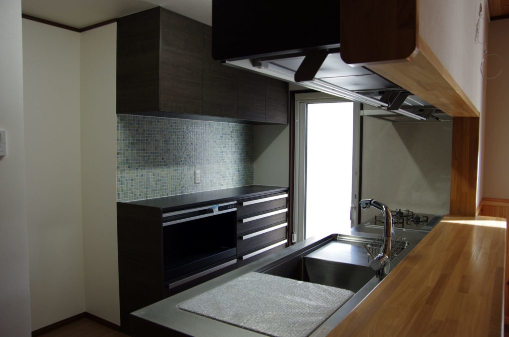 リビングダイニングとの対面。ブラウン系色とモザイクの組合せになりました。