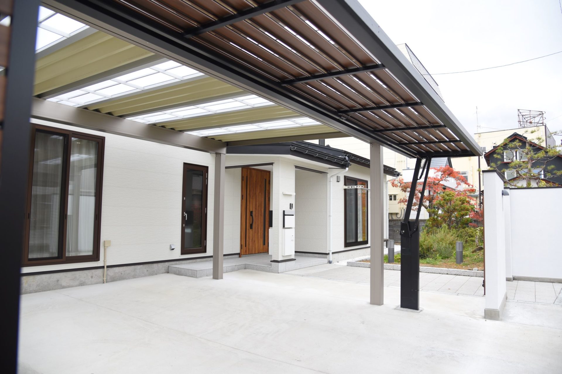 (駐車場) 折板カーポートと跳ね上げゲートの組合せです。
