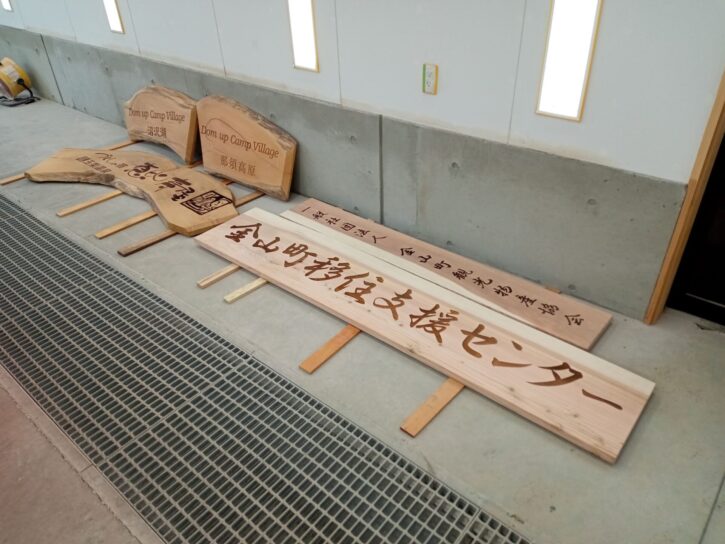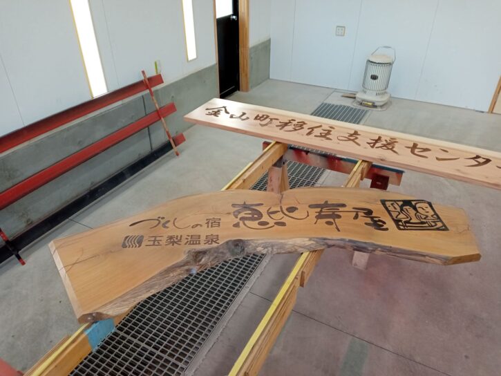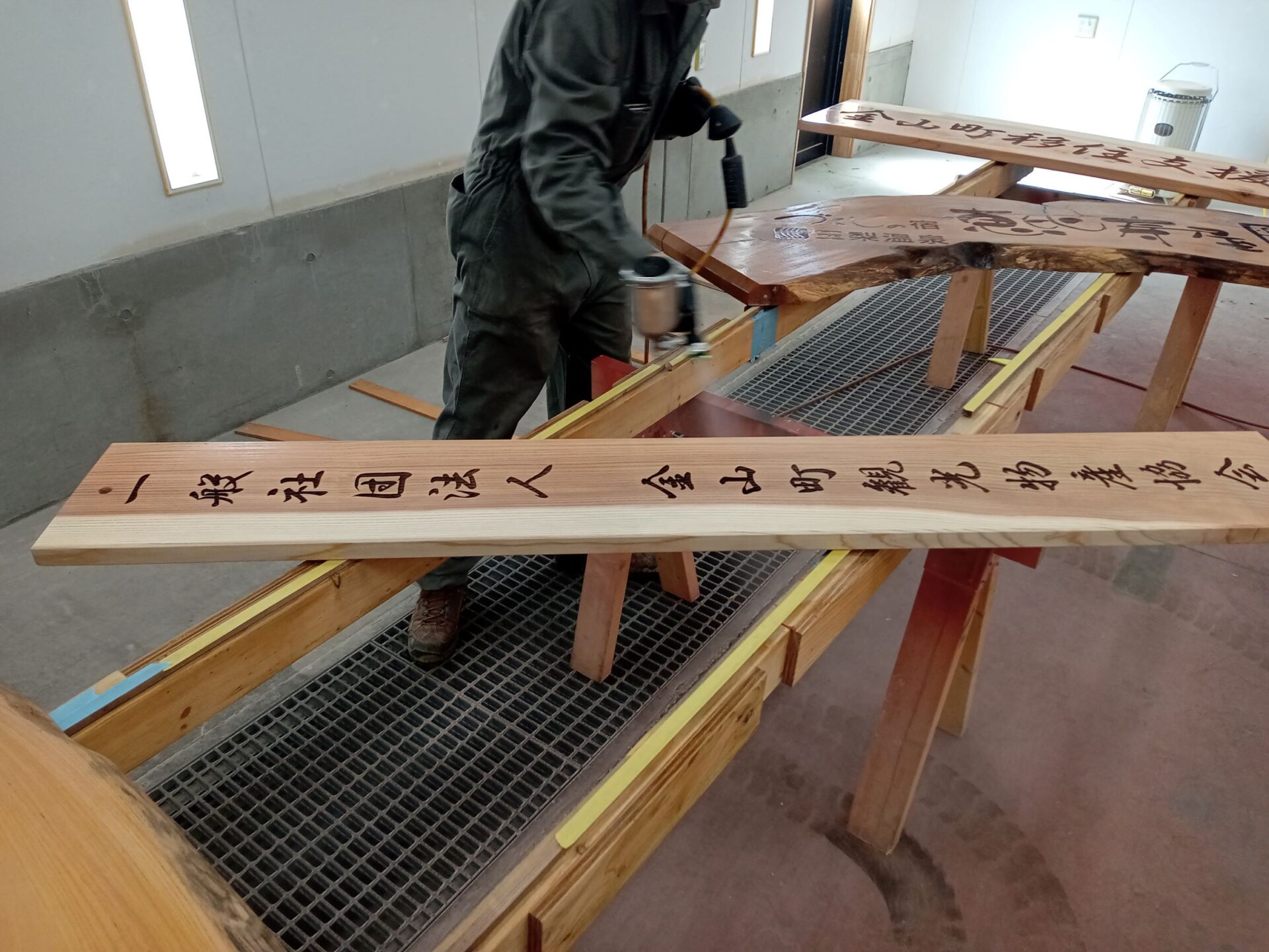 ご注文のご指名を頂きありがとうございました。 【画像をクリックするとポップアップ表示します】 欅と杉の板材にレーザーで文字を彫った看板です。 板の木目とレーザーの焦げ色の対比がとても綺麗な印象です。こちらに液体ガ ラス処理を行っていきます。今回は時間も無い事もあり含浸はせずに塗装のみ で仕上げていきます。 《弊社工場に持ち込んで頂いたので、そのまま塗装室で塗装しました。》 《塗装完了です。》 木の質感を残すため艶を出さずに仕上げました。重厚感が増し、趣のある仕上 がりだと思います。
