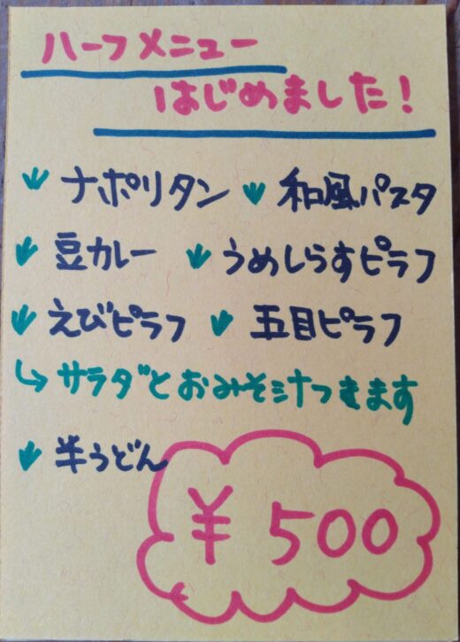 店内の絵画を桜に変えてみました。「サクラ」という魔法の言葉は色々と感じ させてくれます。ご来店の際には、ぜひご鑑賞ください。 ◎ワンコイン・ハーフメニューのご案内です (ちょっと小腹が・・とか、軽めのお食事をとりたいなという時にいかがでしょうか。) こちらは、ジュウガツザクラ(10月桜)の鉢植えです。名前のとおり冬桜 のグループとなります。年に2度、春・秋の2季咲き桜です。 (エドヒガンザクラ+マメザクラの交雑種) つくしも、お待ちしております♪(nagomi #36)