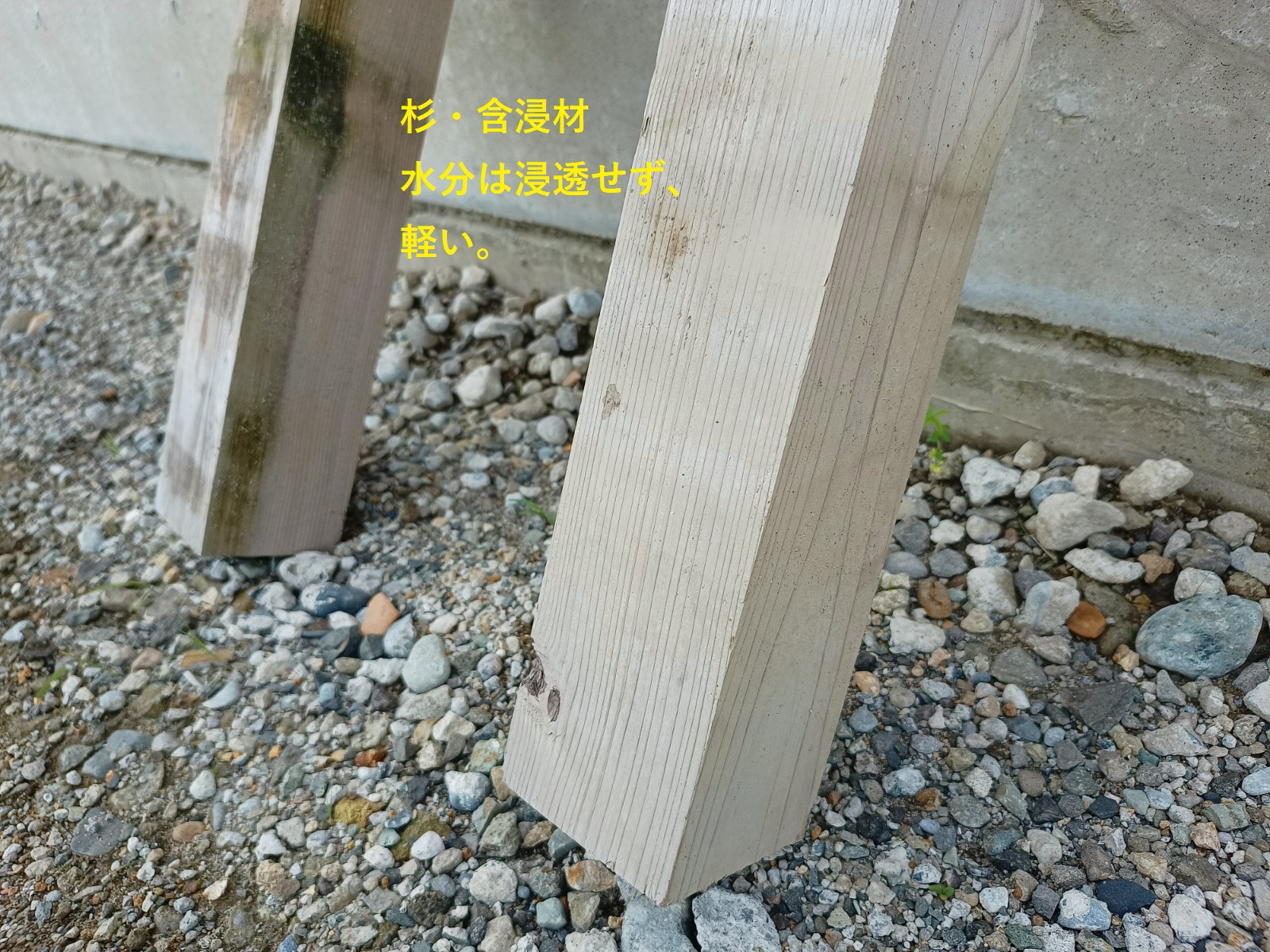 重量感があり、(右)杉・含浸材は水分が侵入できず軽く感じました。