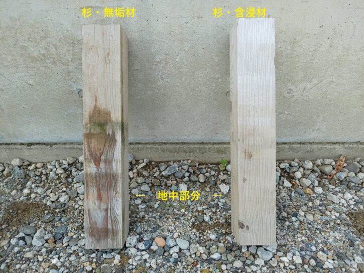 また、双方の地中部分を比べると、未処理の杉・無垢材の一部に変色した箇所を