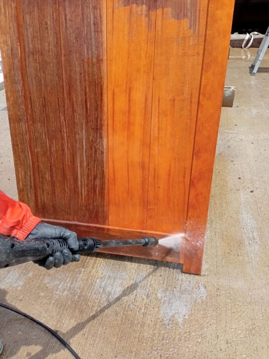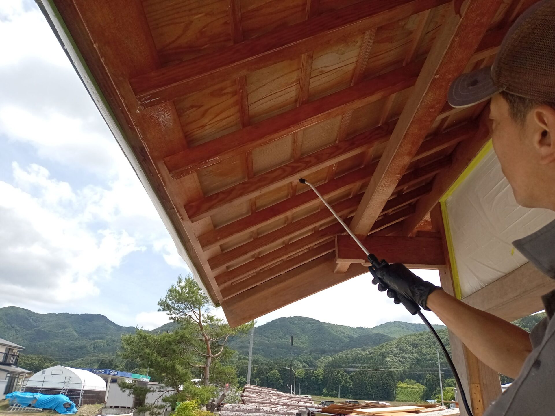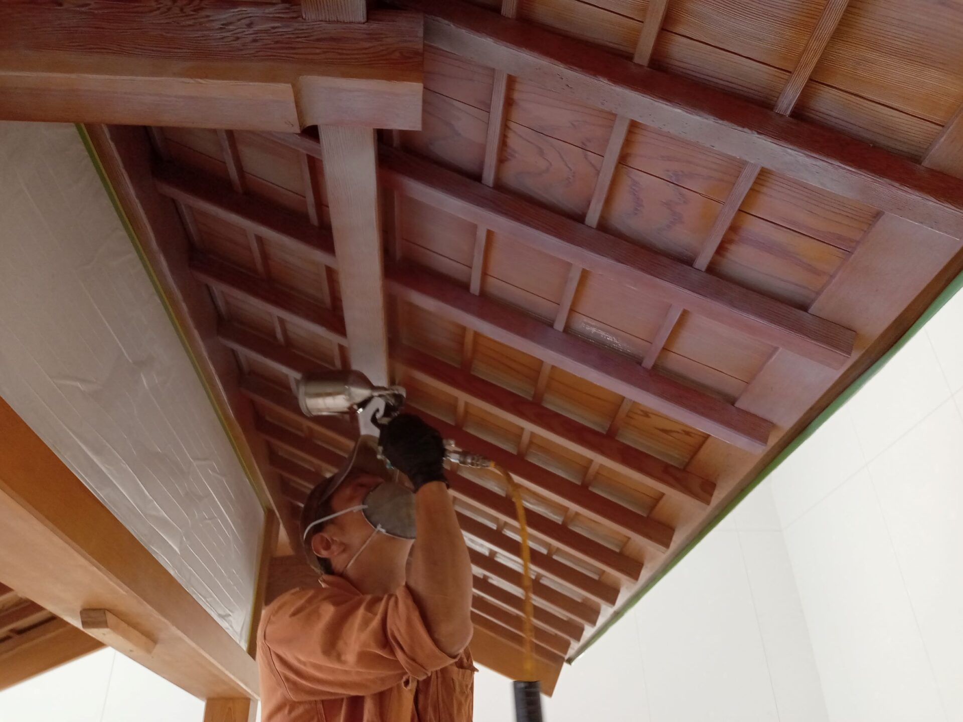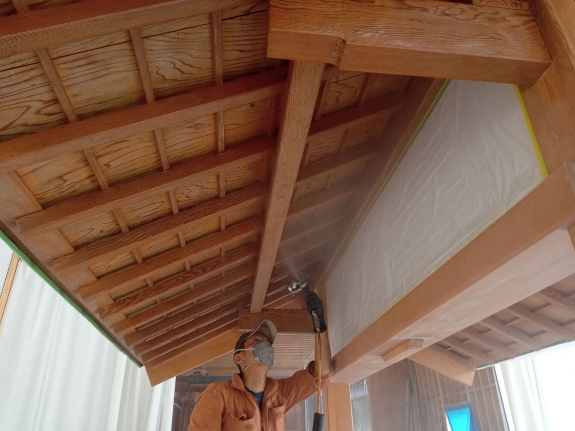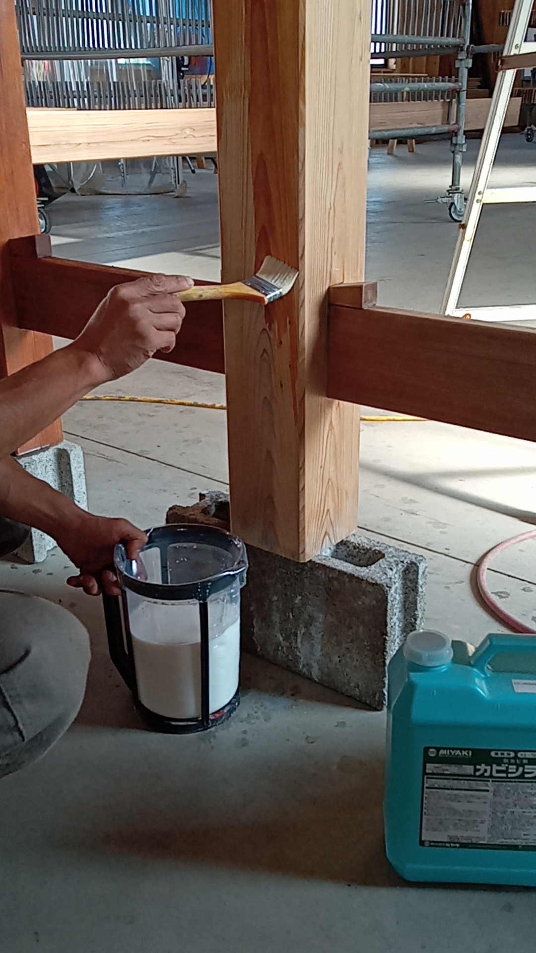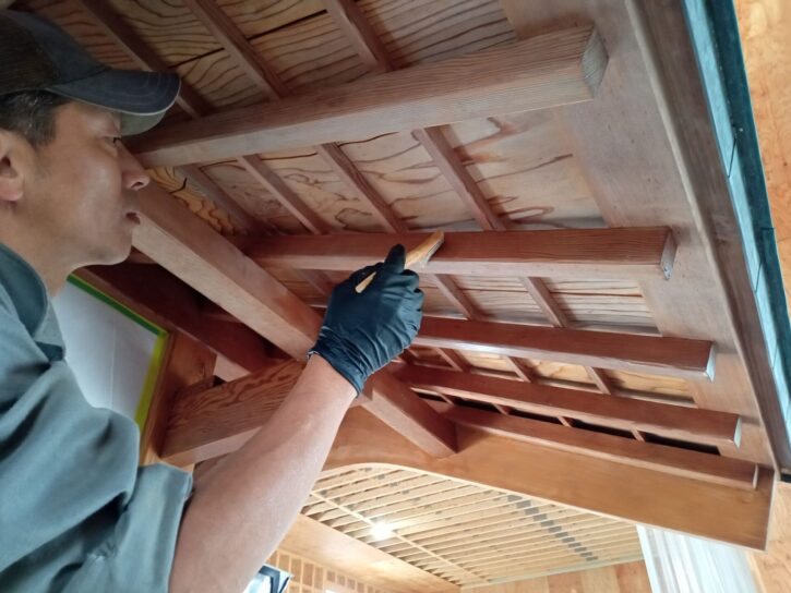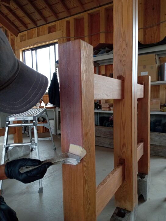 「木あじ」を施工します。塗布直後は白色ですが、乾燥すると透明に変化して