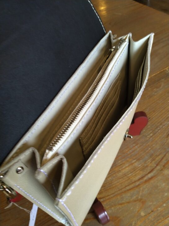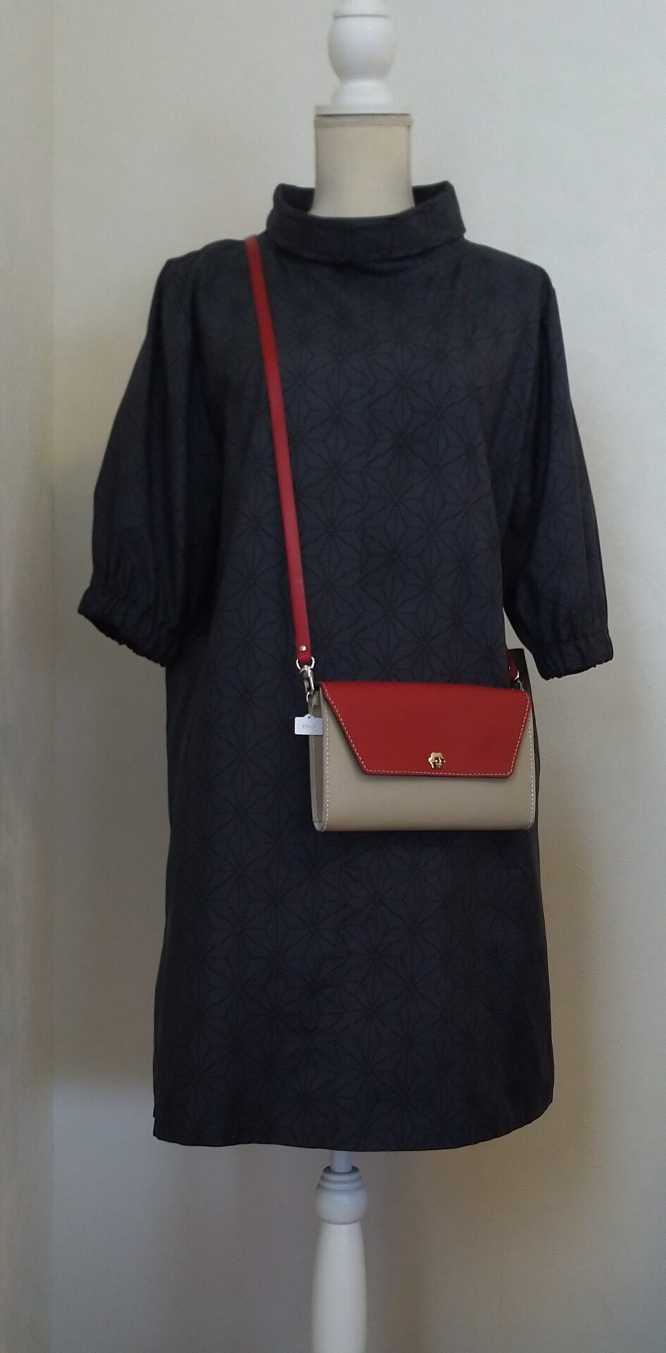 赤い肩ひもと同じ色のふた部分が可愛いお財布ポシェットです。中は