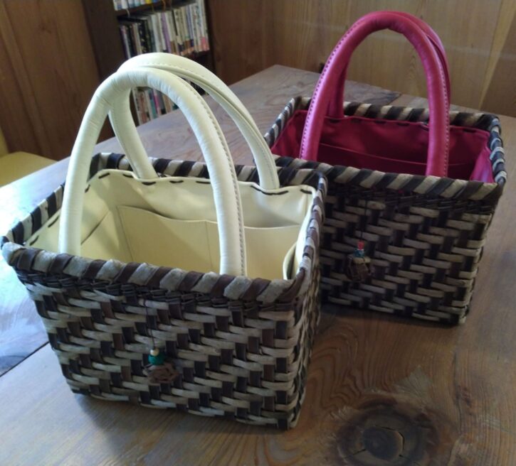 コロンとしたかわいい形のカゴバッグです。内側に革のポケットが五つあり、