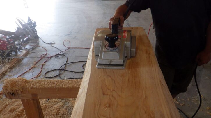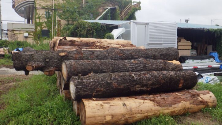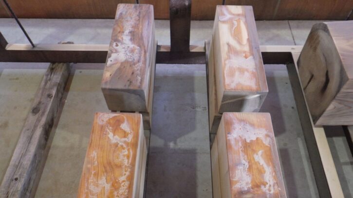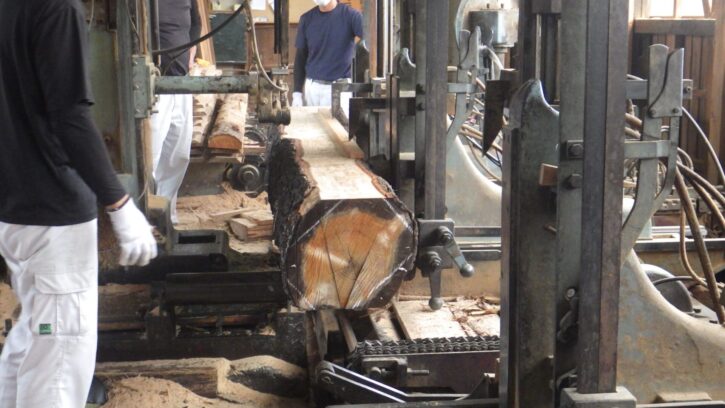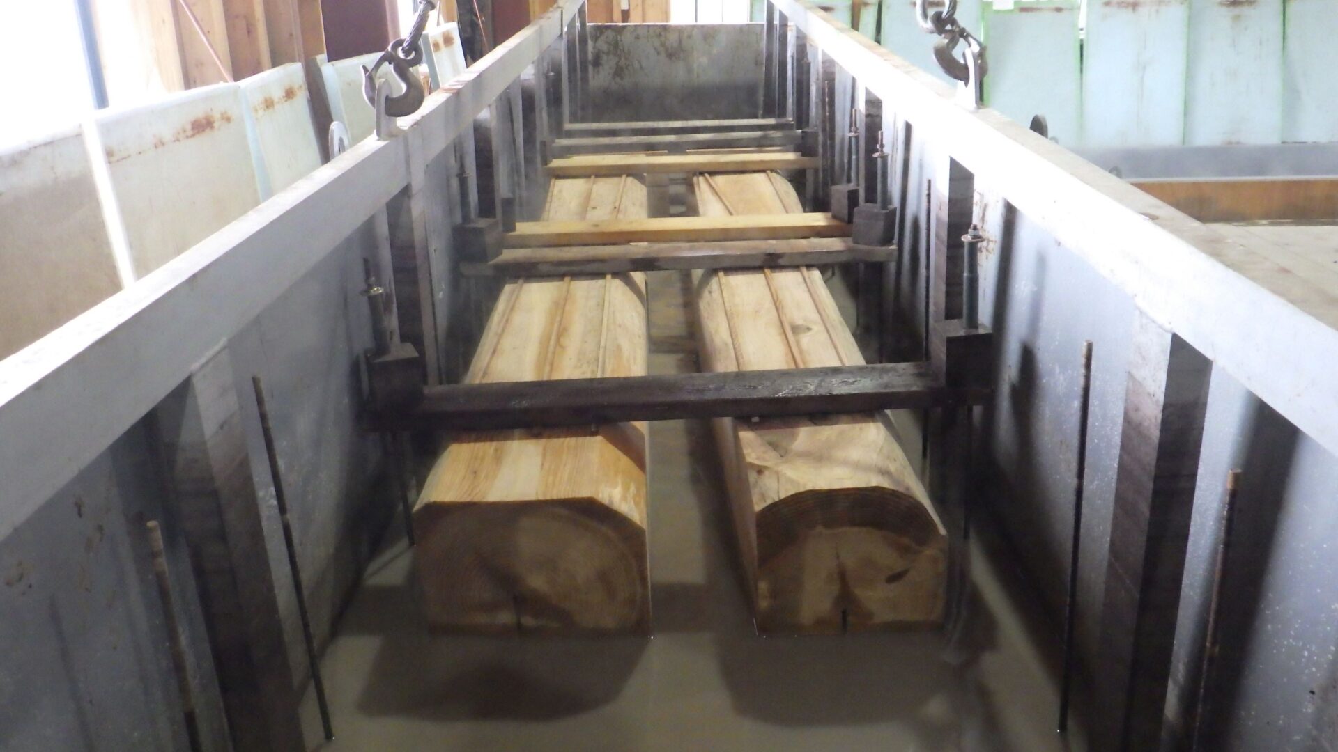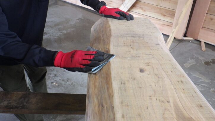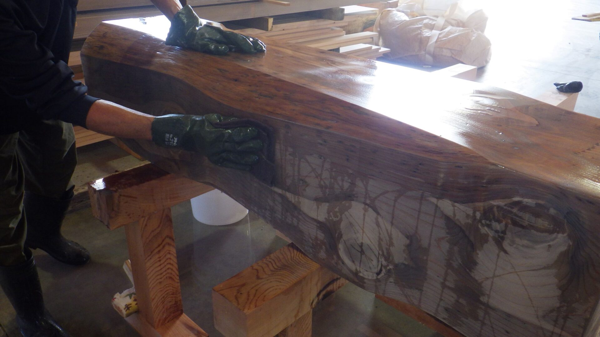 液体ガラスの含侵前作業として加工や研磨をしていきます。原木の丸み