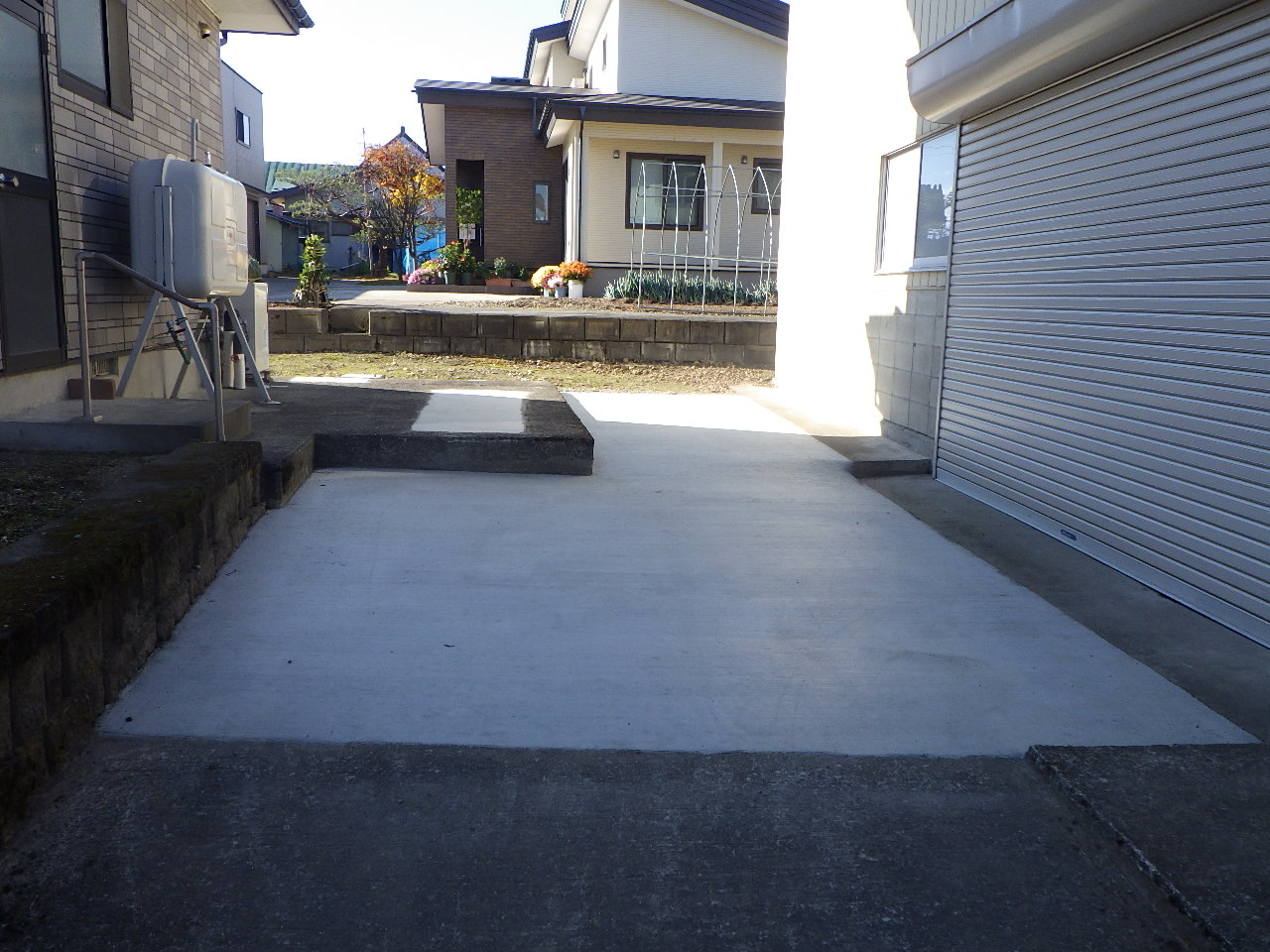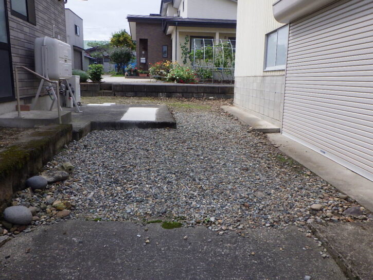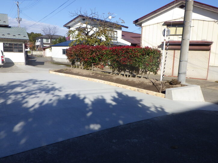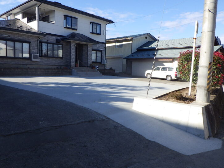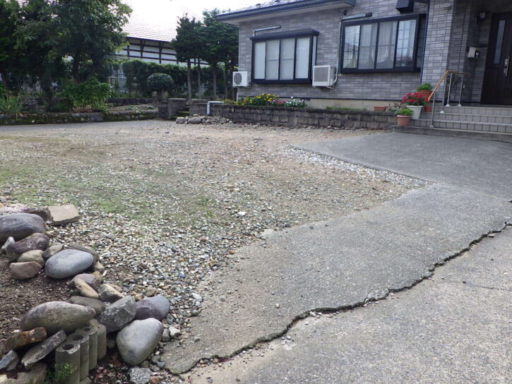 母屋前の駐車場の表土掘削と整正後のコンクリート舗装、段差解消のための