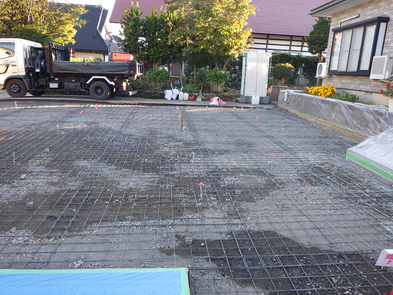 舗装の為メッシュシートを敷いた状況 車両出入り口付近の既設構造物の撤去