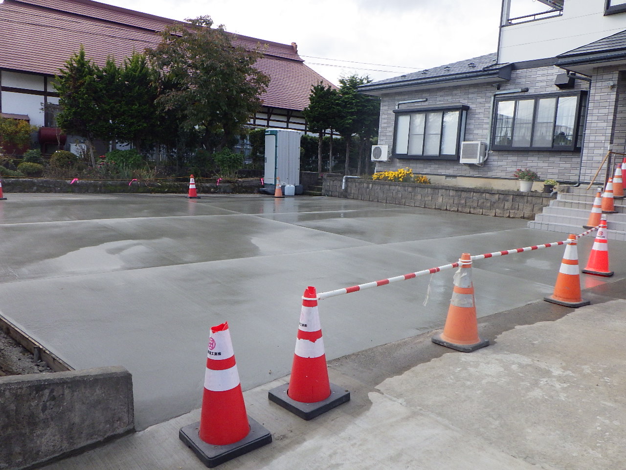 コンクリート舗装後の養生をしています。(猫注意!)