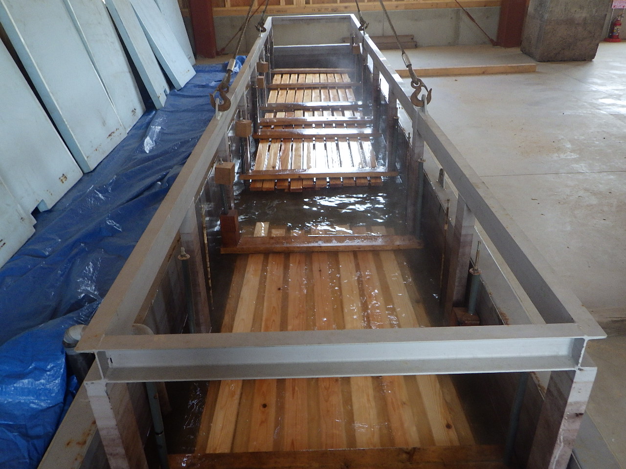 (2)杉板を冷浴することによる液体ガラスの含侵。