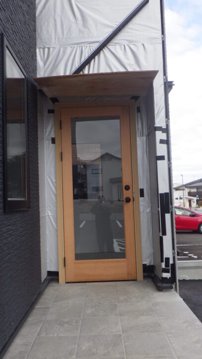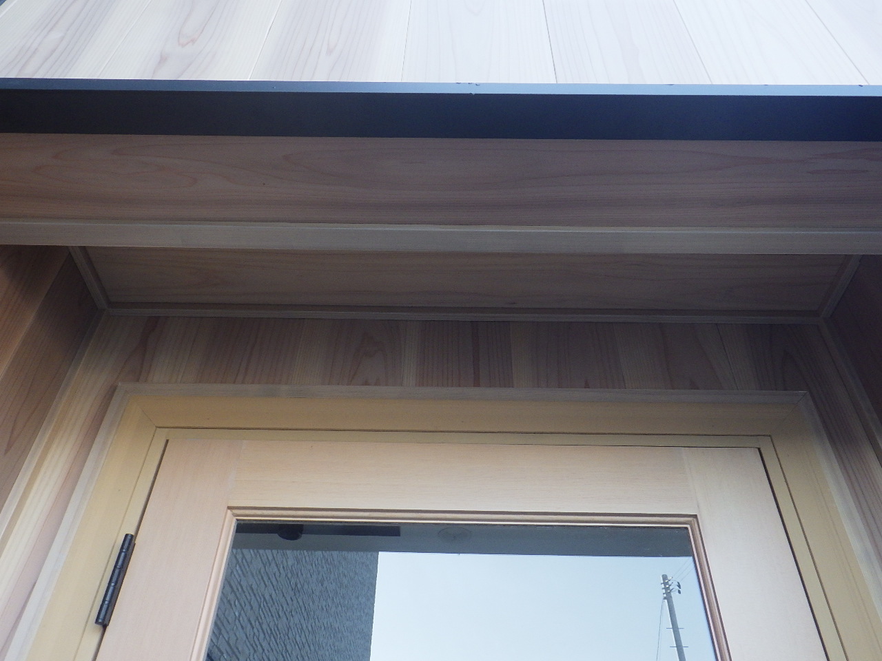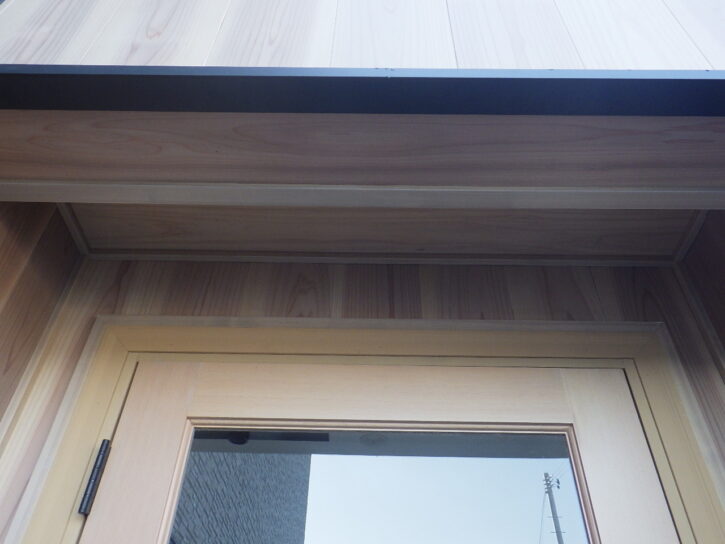 玄関廻りの外壁部分は、門田工場で生産した杉の羽目板を張り、玄関ド