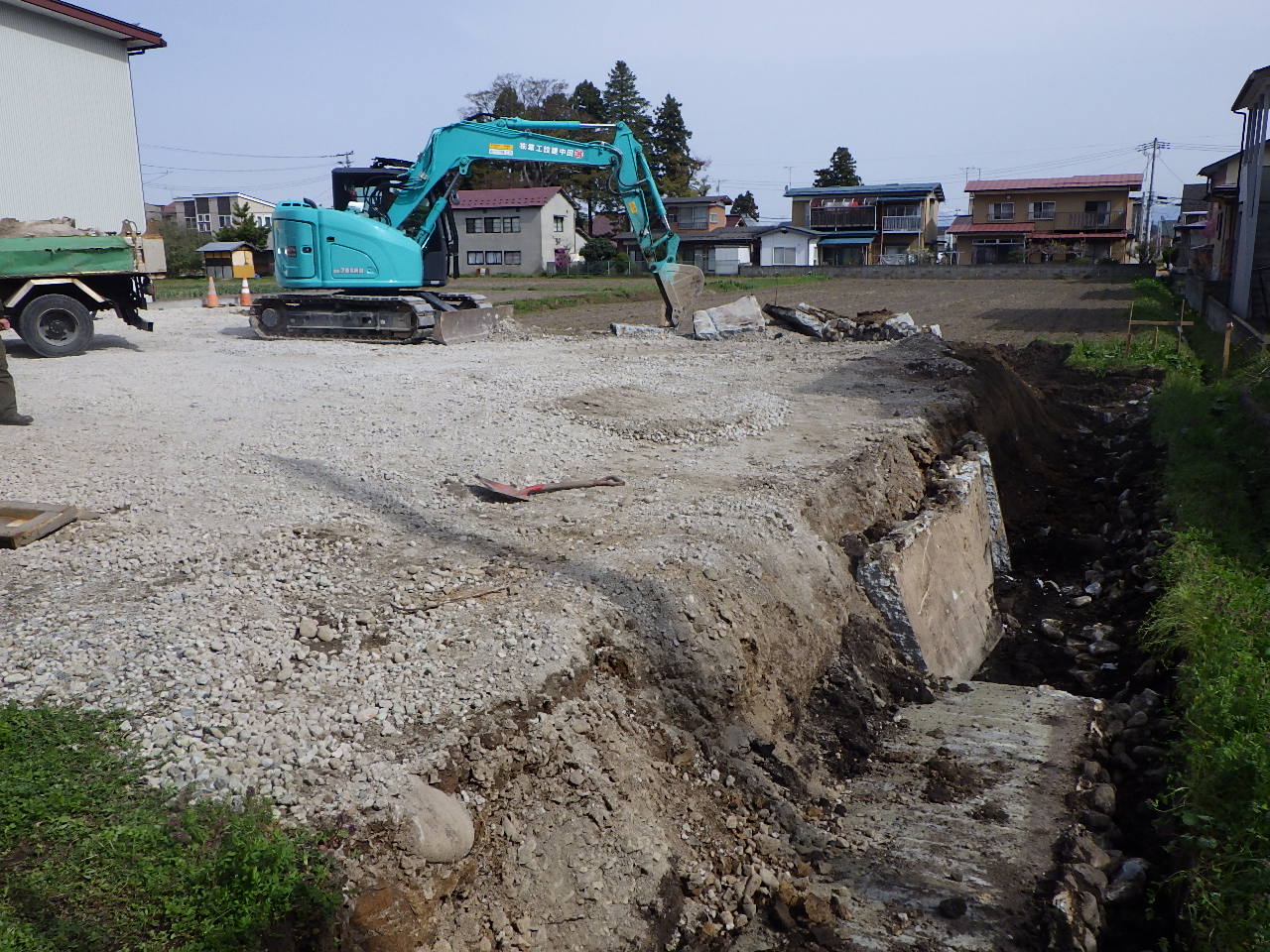 既存の構造物を撤去するため、土砂の掘削と搬出を行い新たな擁壁を新設するための