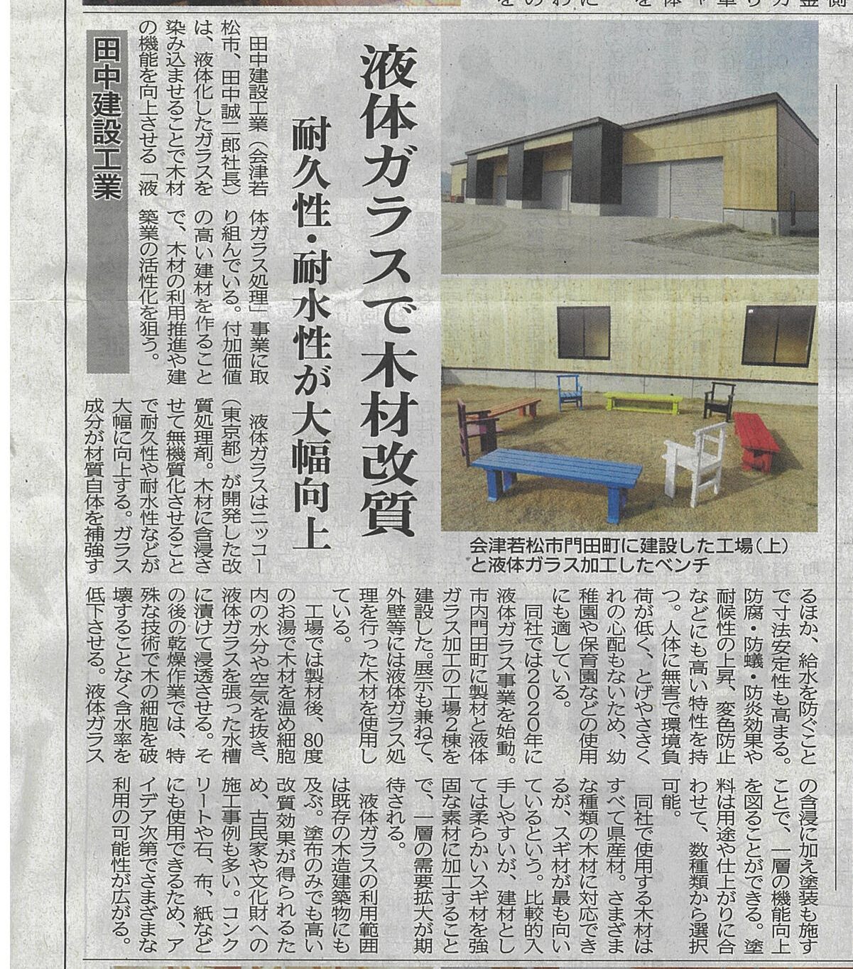 3.18 我社の液体ガラス事業が、3月15日の福島建設工業新聞「木造・木質化で選ばれるまちづくり」の記事に取り上げていただきました!! こういったメディアをきっかけに液体ガラス事業の周知もあがればとおもいます。 福島建設工業新聞社 様このたびは取り上げていただきありがとうございました。