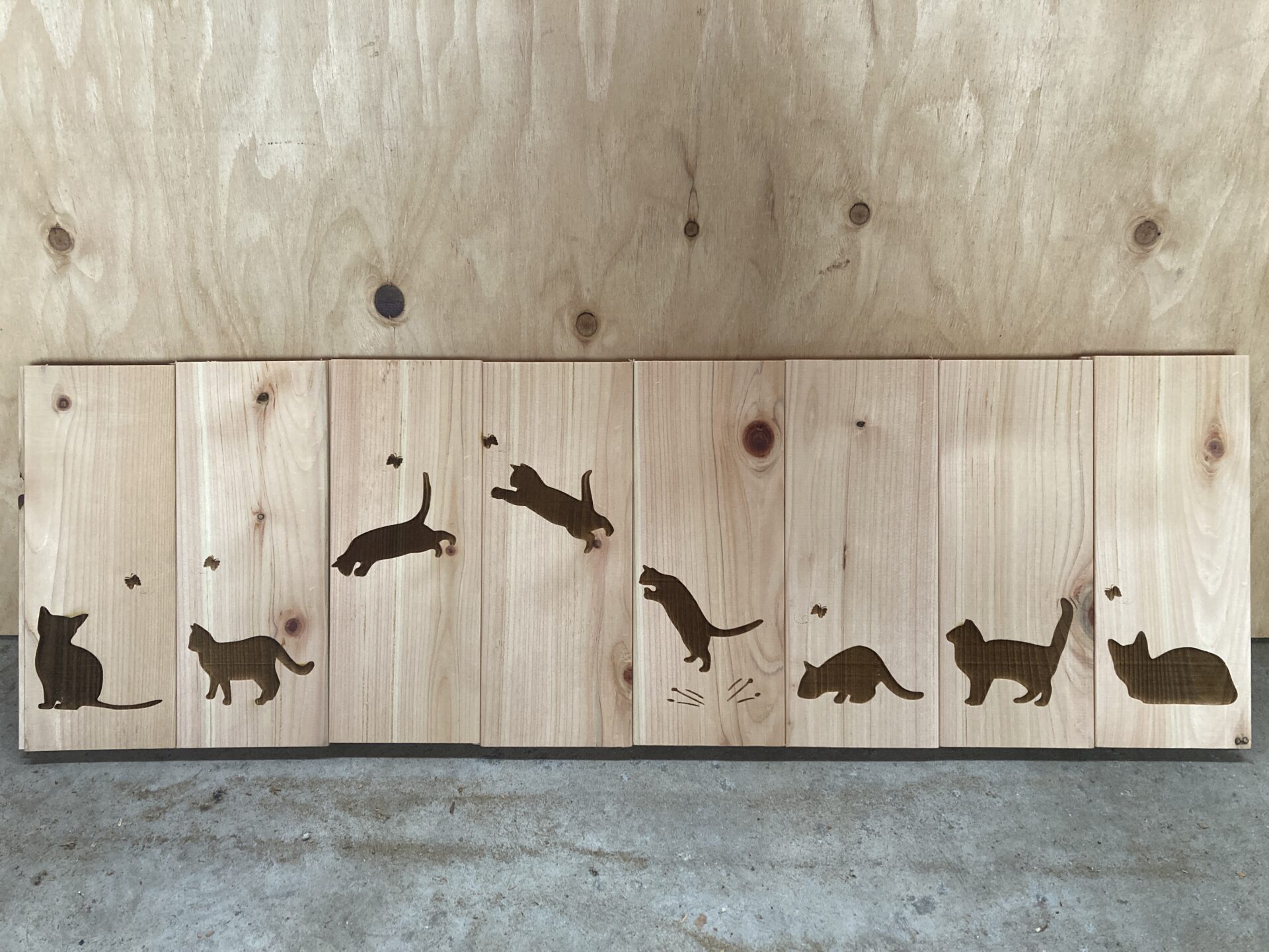 新入社員が当社で製造している羽目板に我社のレーザー加工機で猫を彫刻しました!