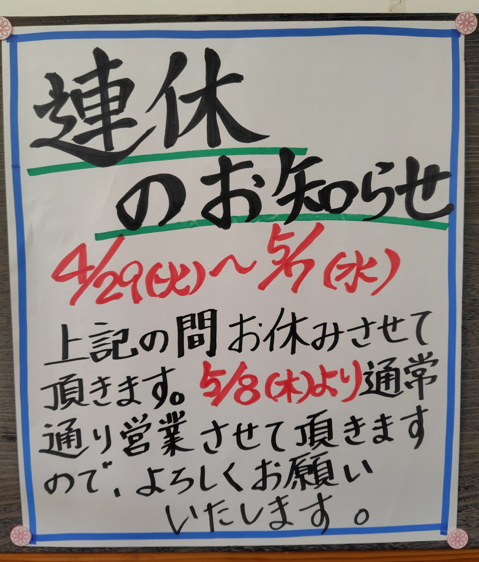 4/29(火)~5/7(水)まで誠に勝手ではございますがお休みさせていただきます<(_ _)>