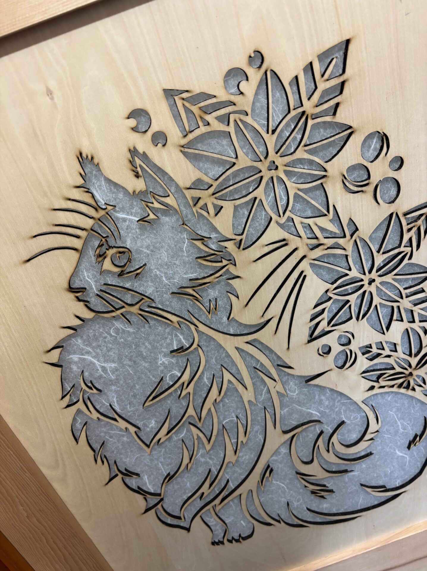 レーザーで切り抜いた裏面に和紙柄のアクリル板をつけ、オシャレな扉に仕上がりました。