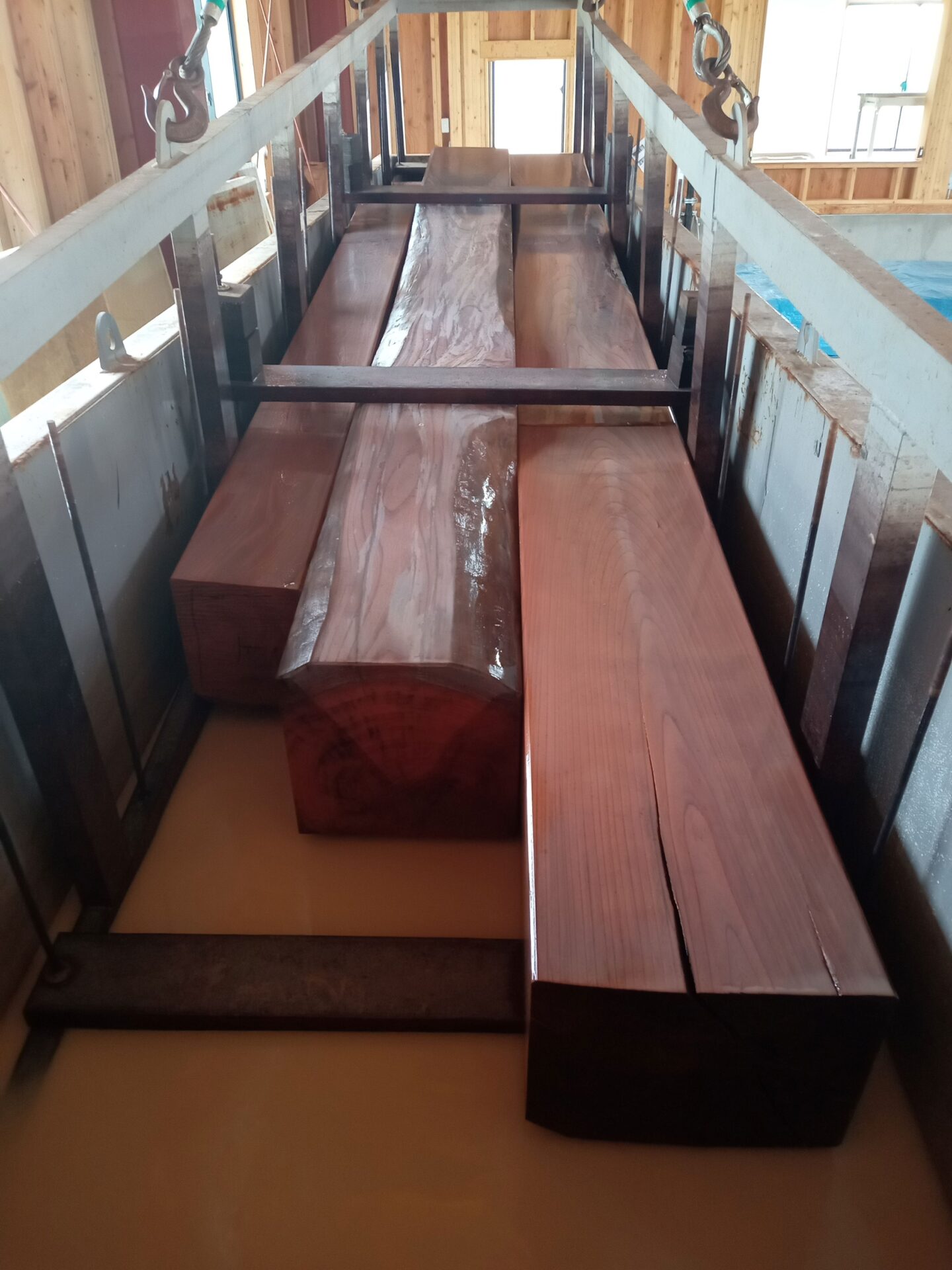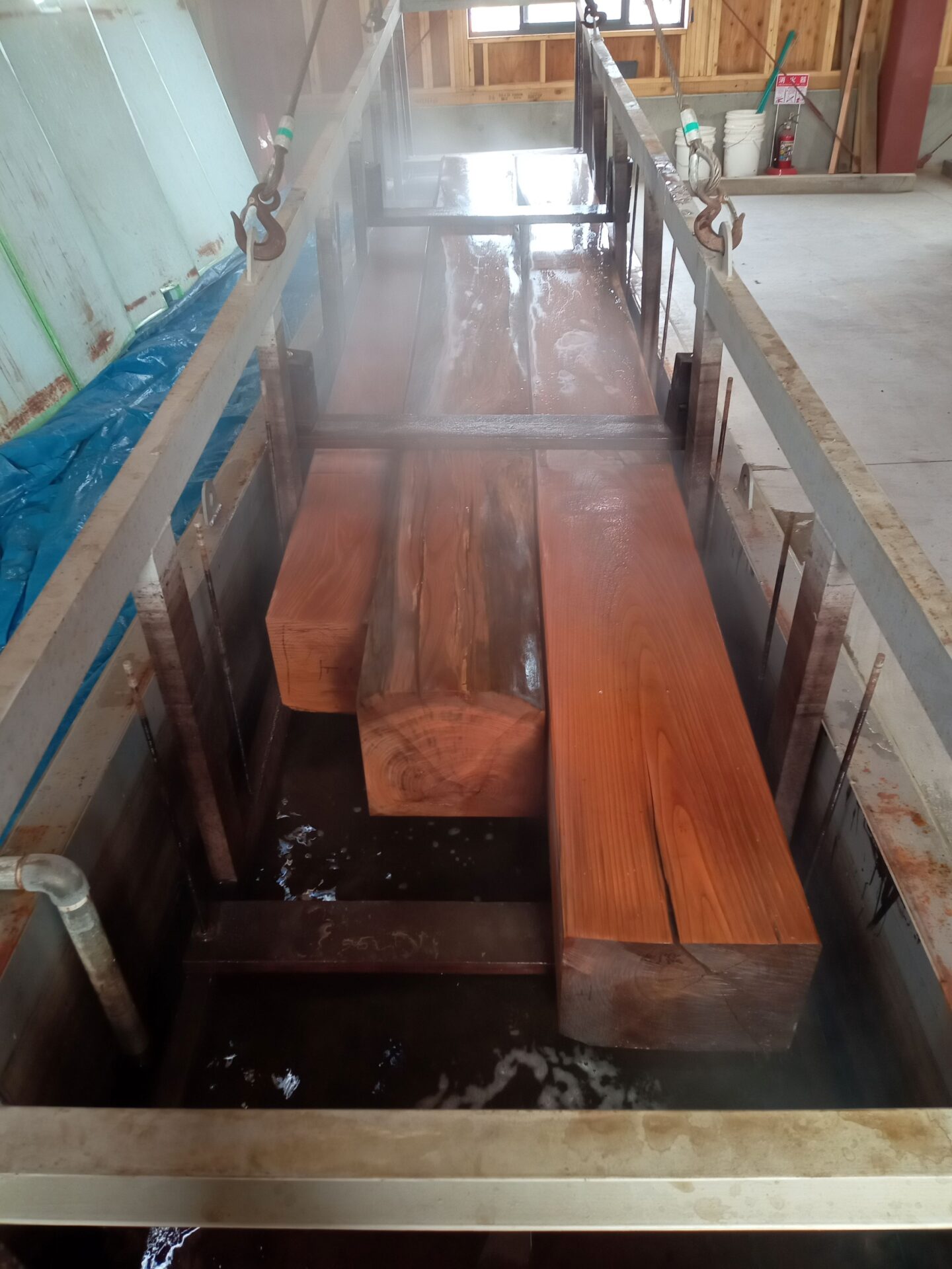 「木あじ」を施工します。塗布直後は白色ですが、乾燥すると透明に変化して