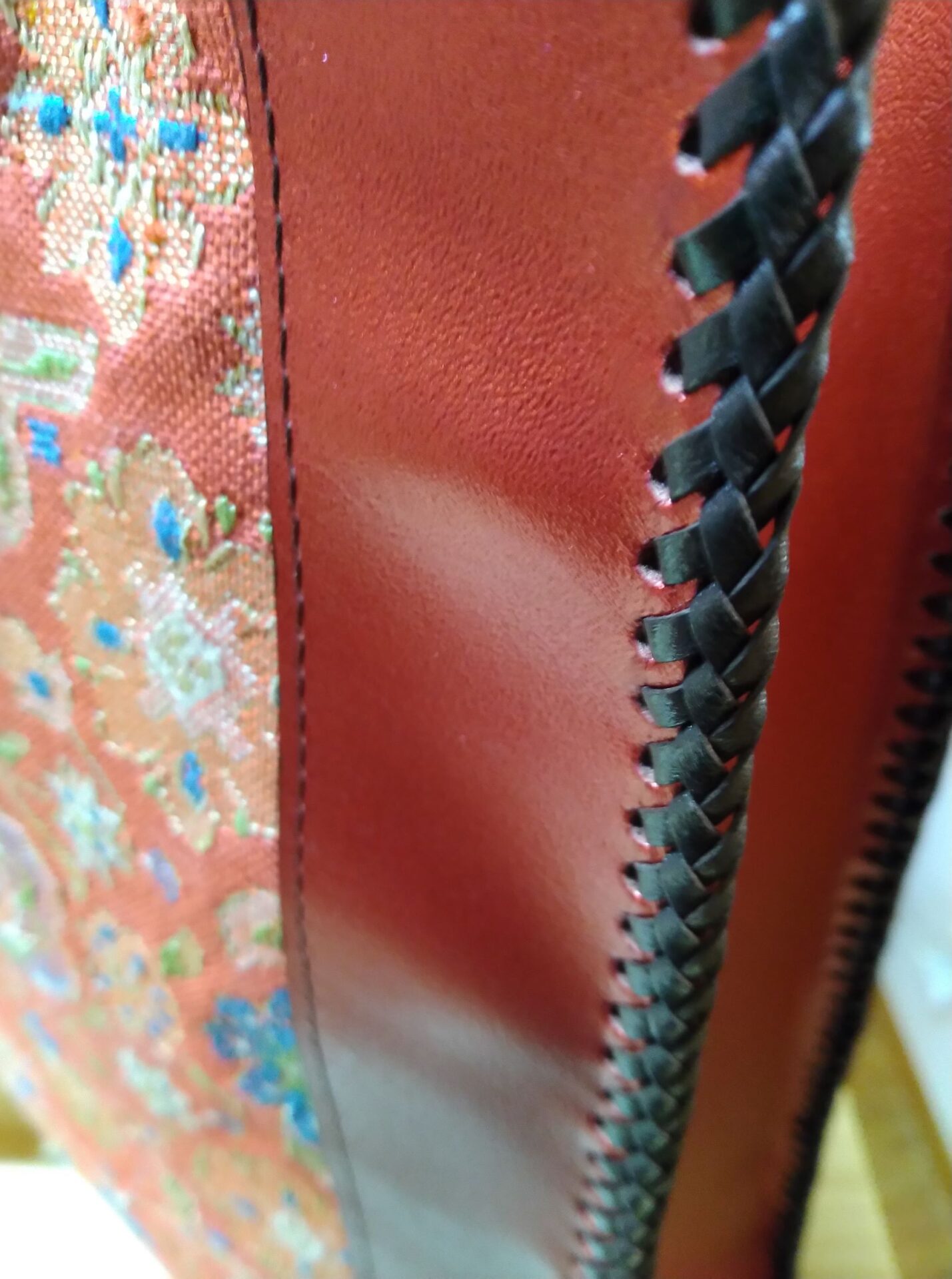 ●赤い帯地と赤色革の手提げ price¥18,000.-