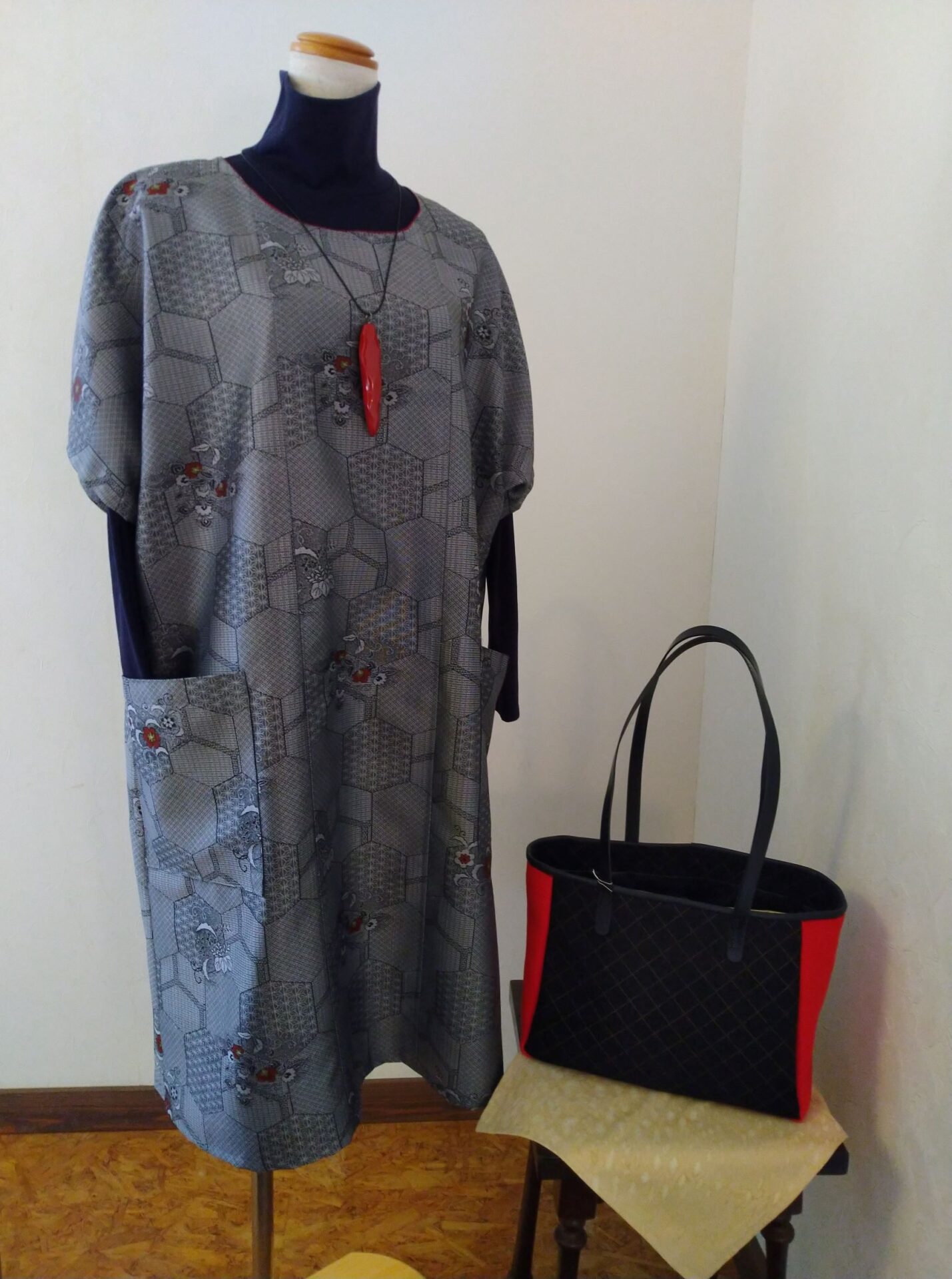 チュニックは光沢のあるグレイの生地に細かい模様が入っており、バッグは