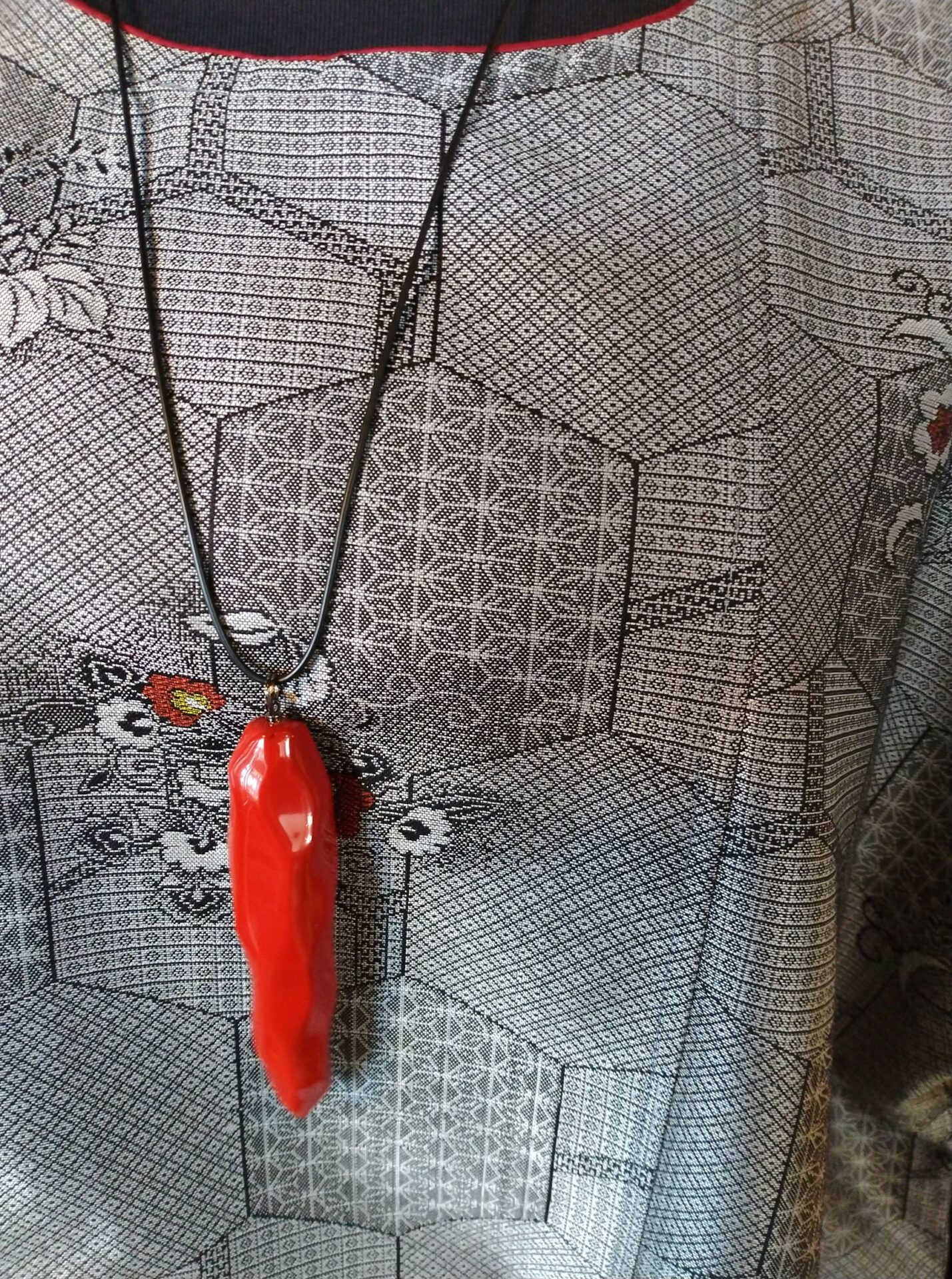 大きいですがとっても軽い漆のネックレス。コードが長いので金具の着脱の面倒が