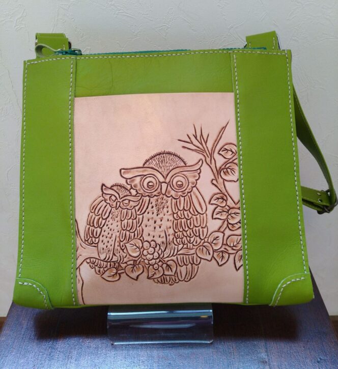 革にナイフで切り込みを入れたり刻印を打って凸凹を作っていくレザークラフト