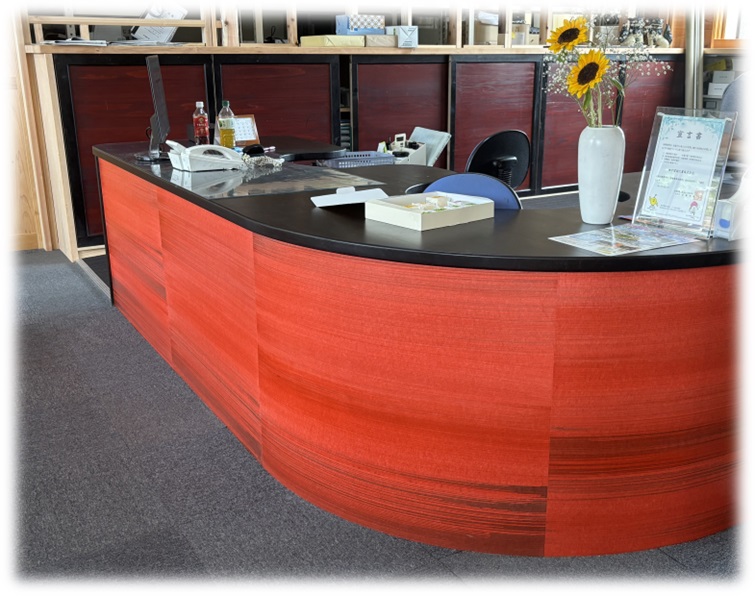 事務所内ではなかなか見られない赤系の色で高級感ある受付になりました!